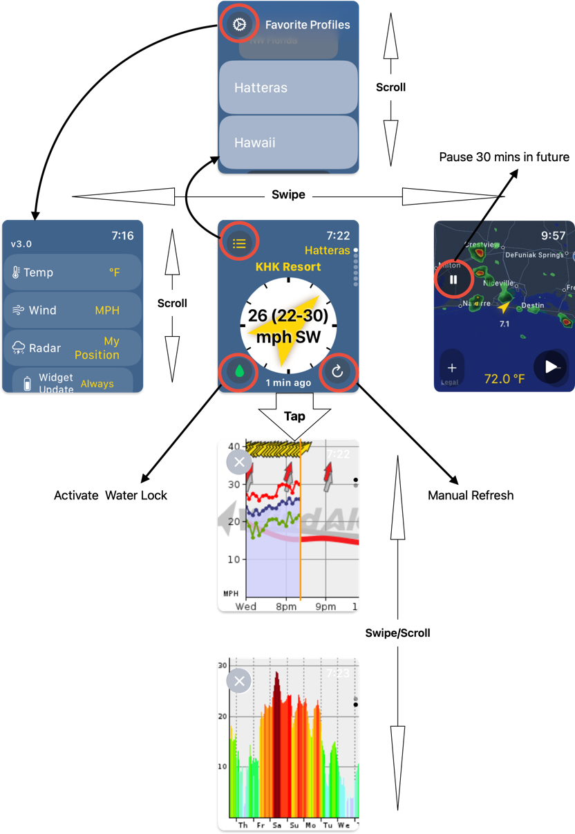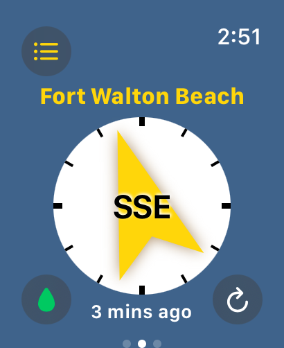The main screen with the compass and wind speed is a scrollable list of the weather stations (spots) that have been recorded in your Favorites Profiles in your WeatherFlow app or web site.